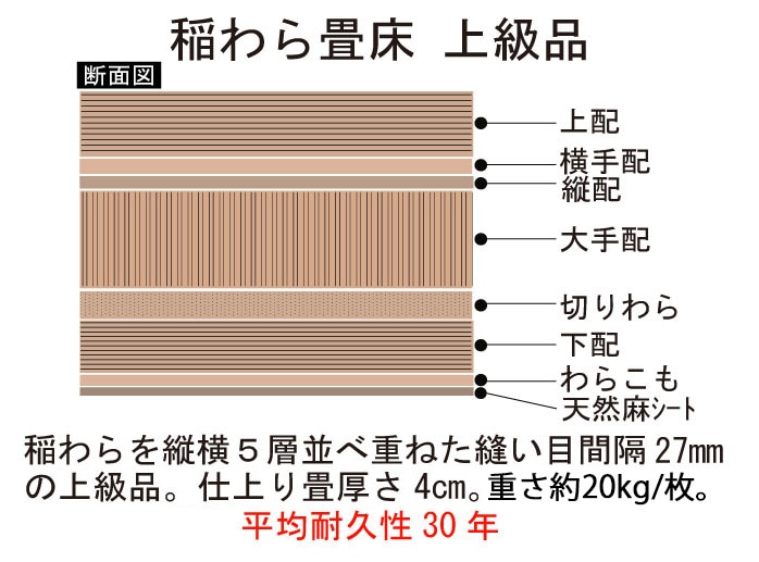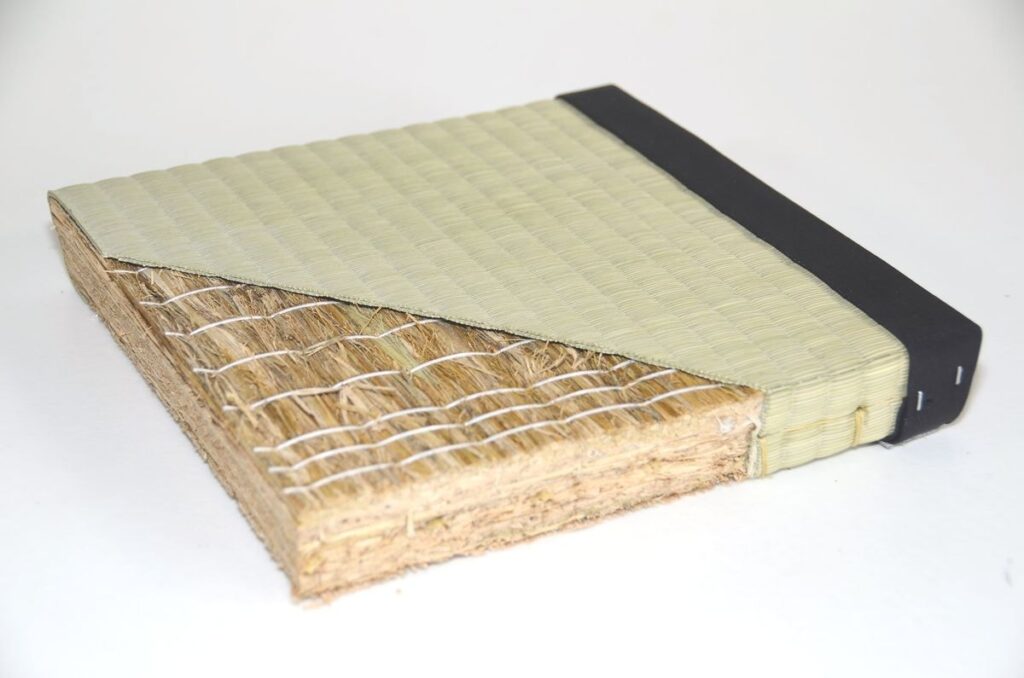 一般稲わらを選別し、内部に稲わらの芯だけを編み込んだ菰を2枚入れた厚さ35mmの稲わら畳床。
